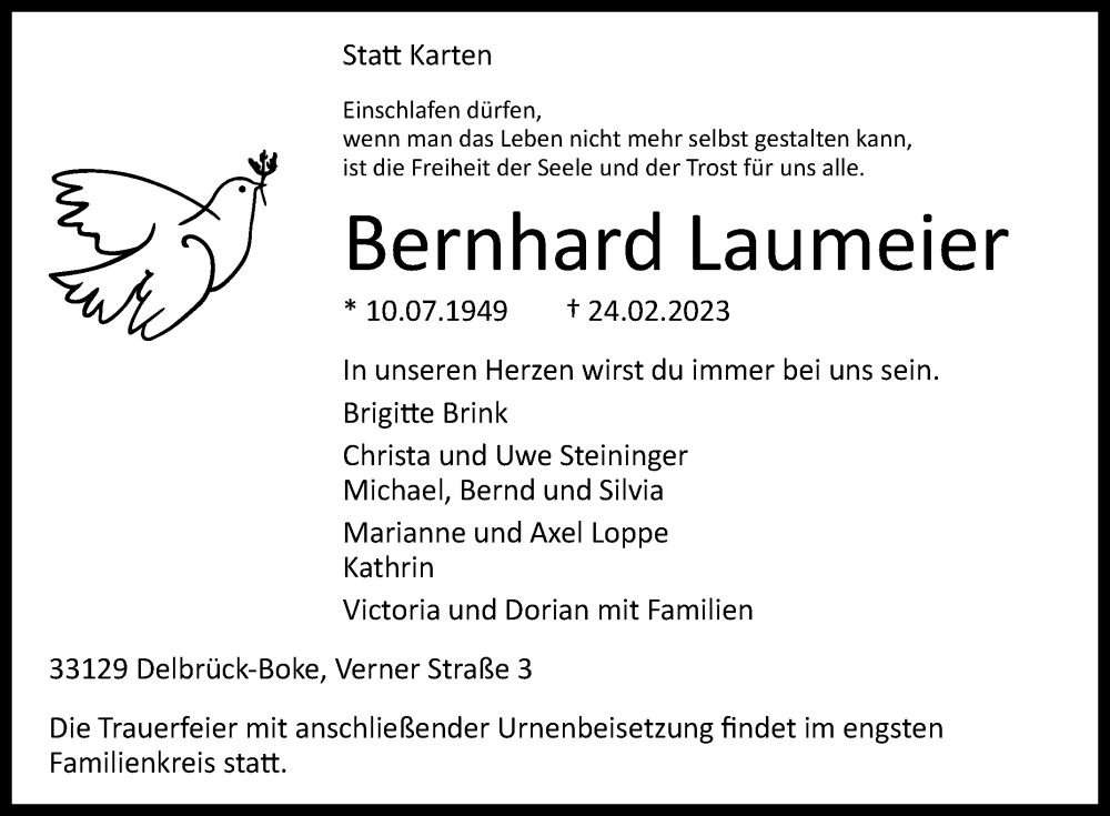 Hier finden Sie alle Traueranzeigen aus der Zeitung, die bisher für Bernhard Laumeier erschienen sind. Weitere Traueranzeigen, die in der Zeitung erscheinen, werden hier ebenfalls aufgelistet