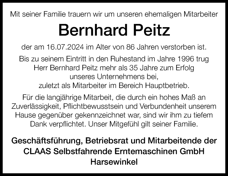 Hier finden Sie alle Traueranzeigen aus der Zeitung, die bisher für Bernhard Peitz erschienen sind. Weitere Traueranzeigen, die in der Zeitung erscheinen, werden hier ebenfalls aufgelistet