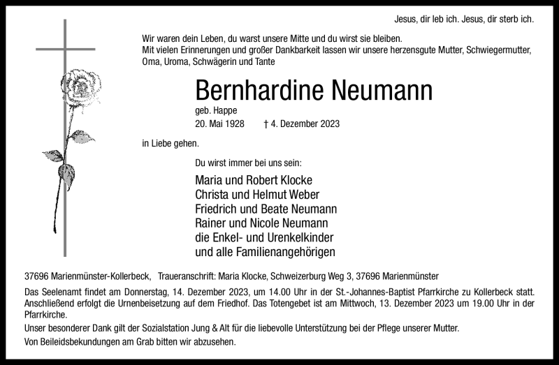Hier finden Sie alle Traueranzeigen aus der Zeitung, die bisher für Bernhardine Neumann erschienen sind. Weitere Traueranzeigen, die in der Zeitung erscheinen, werden hier ebenfalls aufgelistet