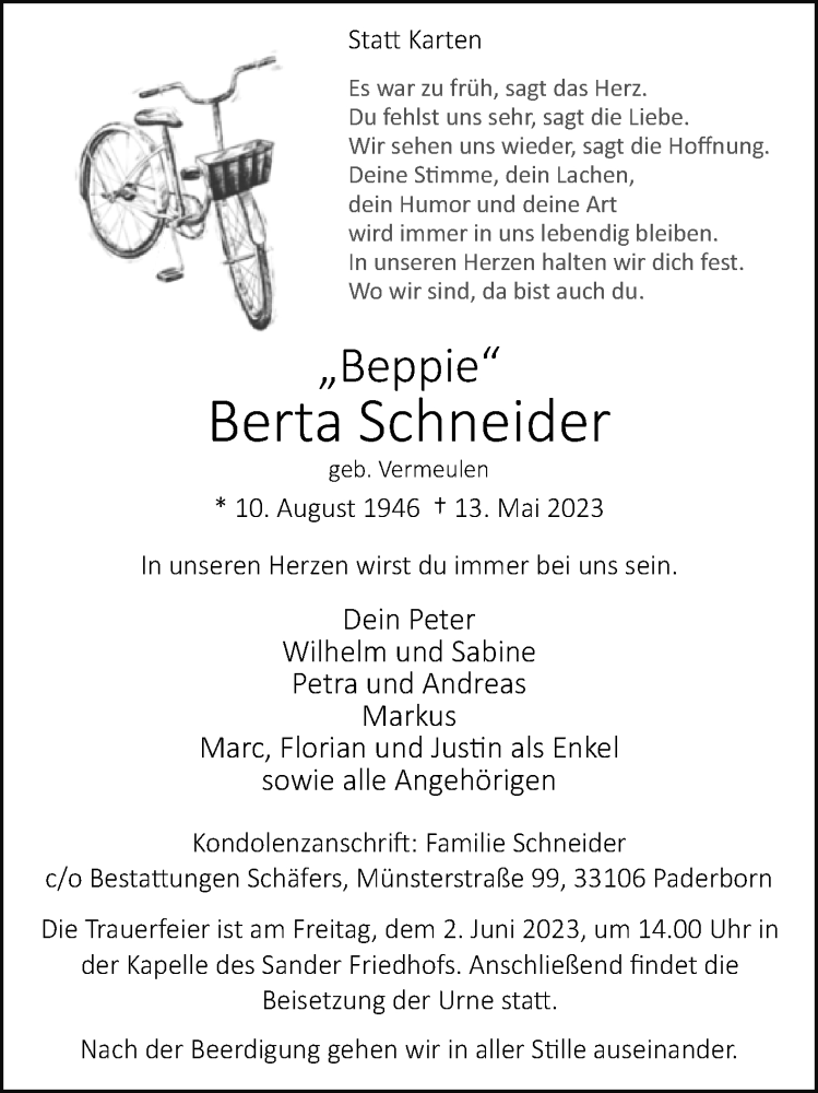 Hier finden Sie alle Traueranzeigen aus der Zeitung, die bisher für Berta Schneider erschienen sind. Weitere Traueranzeigen, die in der Zeitung erscheinen, werden hier ebenfalls aufgelistet