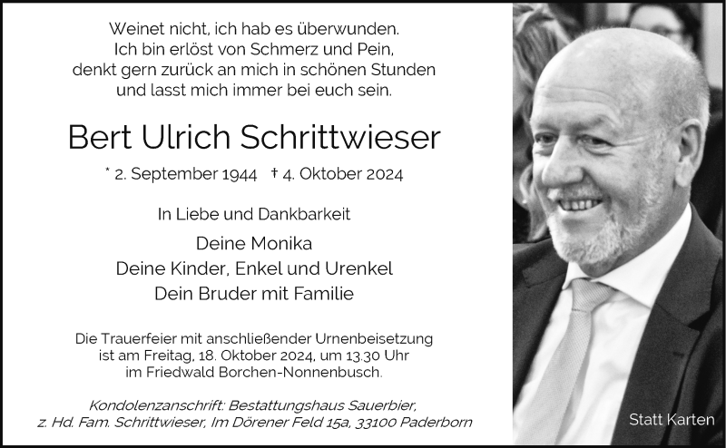 Hier finden Sie alle Traueranzeigen aus der Zeitung, die bisher für Bert Ulrich Schrittwieser erschienen sind. Weitere Traueranzeigen, die in der Zeitung erscheinen, werden hier ebenfalls aufgelistet