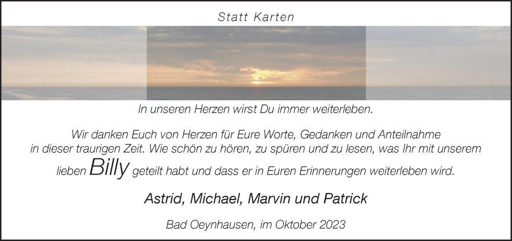 Hier finden Sie alle Traueranzeigen aus der Zeitung, die bisher für Billy erschienen sind. Weitere Traueranzeigen, die in der Zeitung erscheinen, werden hier ebenfalls aufgelistet