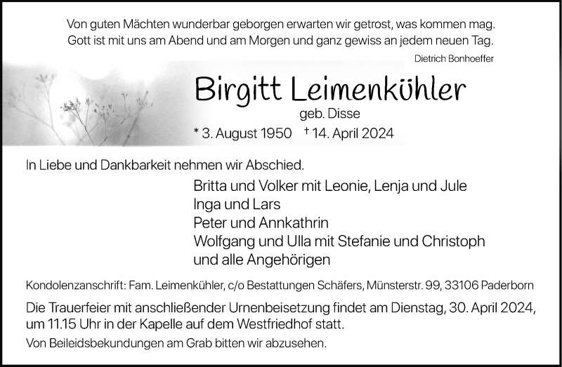 Hier finden Sie alle Traueranzeigen aus der Zeitung, die bisher für Birgitt Leimenkühler erschienen sind. Weitere Traueranzeigen, die in der Zeitung erscheinen, werden hier ebenfalls aufgelistet