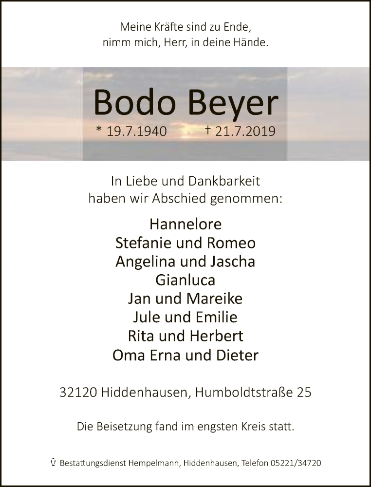 Hier finden Sie alle Traueranzeigen aus der Zeitung, die bisher für Bodo Beyer erschienen sind. Weitere Traueranzeigen, die in der Zeitung erscheinen, werden hier ebenfalls aufgelistet