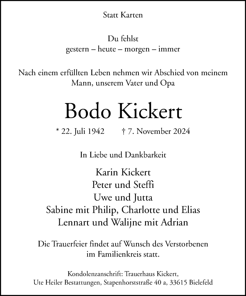 Hier finden Sie alle Traueranzeigen aus der Zeitung, die bisher für Bodo Kickert erschienen sind. Weitere Traueranzeigen, die in der Zeitung erscheinen, werden hier ebenfalls aufgelistet
