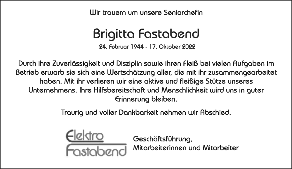 Hier finden Sie alle Traueranzeigen aus der Zeitung, die bisher für Brigitta Fastabend erschienen sind. Weitere Traueranzeigen, die in der Zeitung erscheinen, werden hier ebenfalls aufgelistet