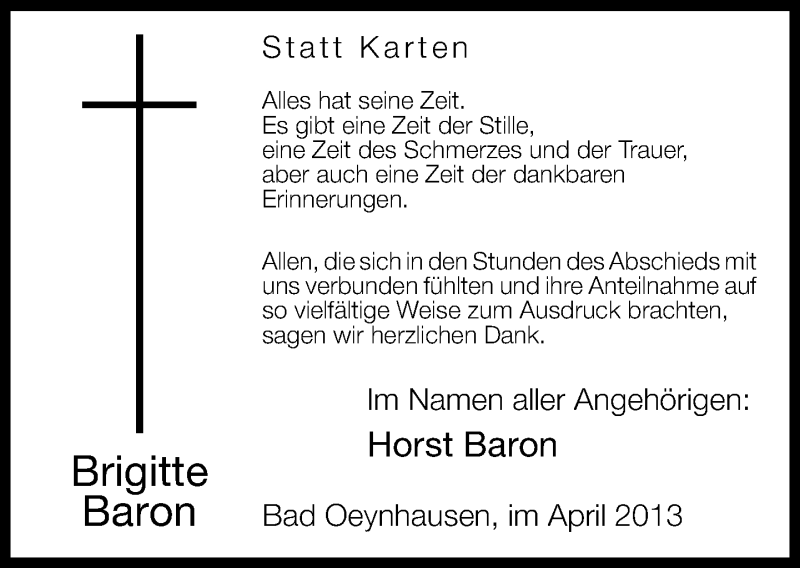 Hier finden Sie alle Traueranzeigen aus der Zeitung, die bisher für Brigitte Baron erschienen sind. Weitere Traueranzeigen, die in der Zeitung erscheinen, werden hier ebenfalls aufgelistet