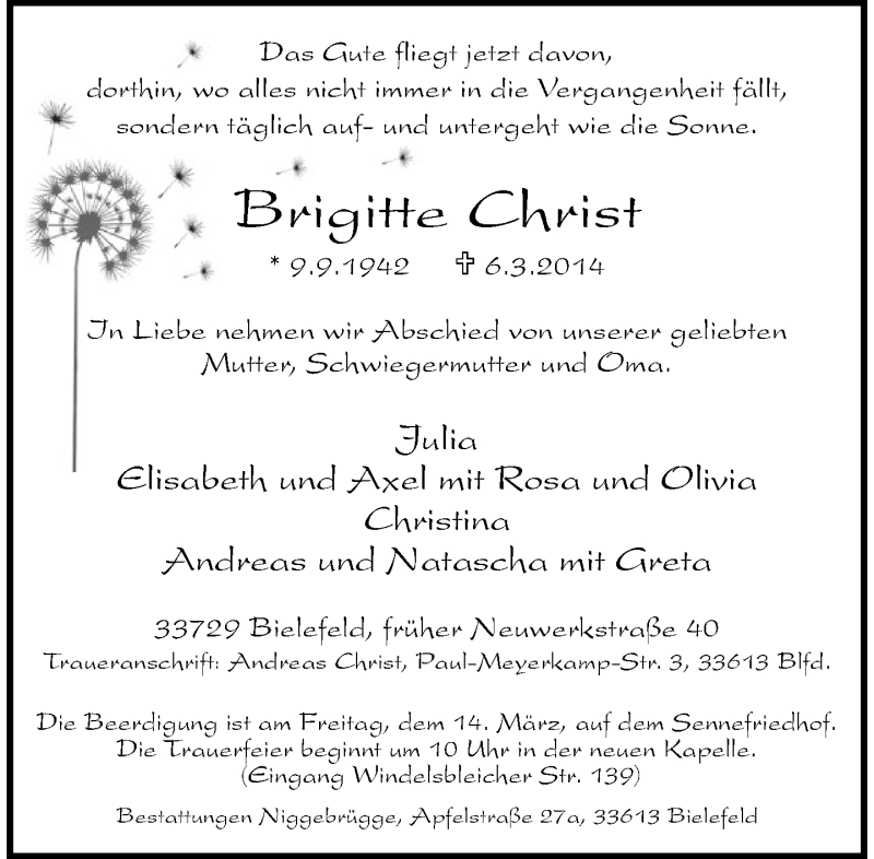 Hier finden Sie alle Traueranzeigen aus der Zeitung, die bisher für Brigitte Christ erschienen sind. Weitere Traueranzeigen, die in der Zeitung erscheinen, werden hier ebenfalls aufgelistet