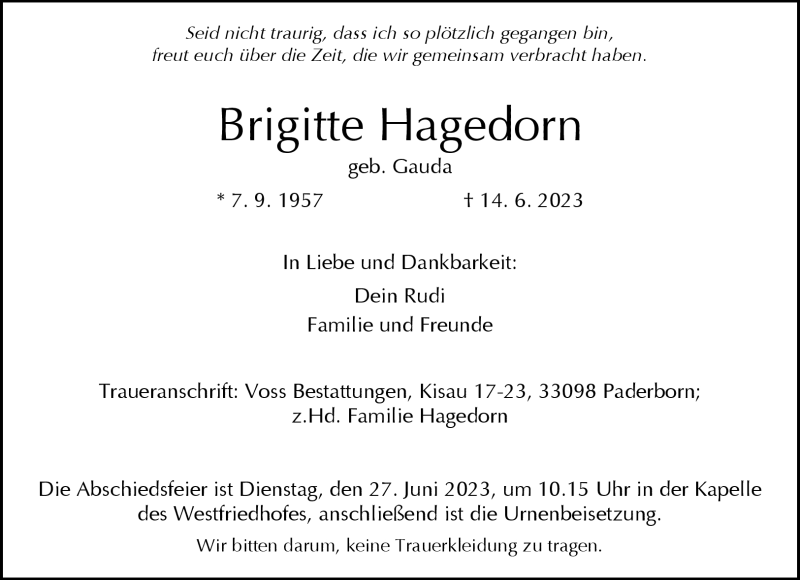 Hier finden Sie alle Traueranzeigen aus der Zeitung, die bisher für Brigitte Hagedorn erschienen sind. Weitere Traueranzeigen, die in der Zeitung erscheinen, werden hier ebenfalls aufgelistet