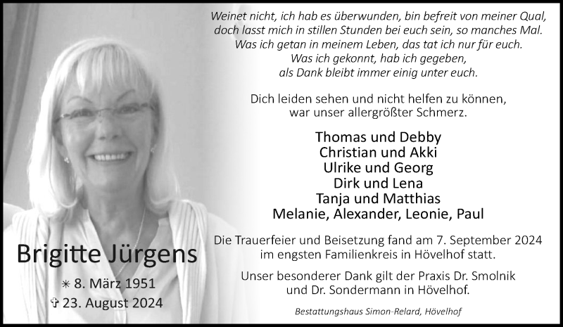 Hier finden Sie alle Traueranzeigen aus der Zeitung, die bisher für Brigitte Jürgens erschienen sind. Weitere Traueranzeigen, die in der Zeitung erscheinen, werden hier ebenfalls aufgelistet