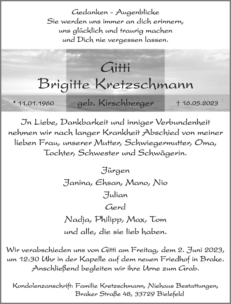 Hier finden Sie alle Traueranzeigen aus der Zeitung, die bisher für Brigitte Kretzschmann erschienen sind. Weitere Traueranzeigen, die in der Zeitung erscheinen, werden hier ebenfalls aufgelistet