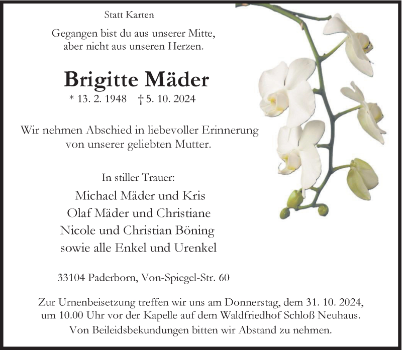 Hier finden Sie alle Traueranzeigen aus der Zeitung, die bisher für Brigitte Mäder erschienen sind. Weitere Traueranzeigen, die in der Zeitung erscheinen, werden hier ebenfalls aufgelistet