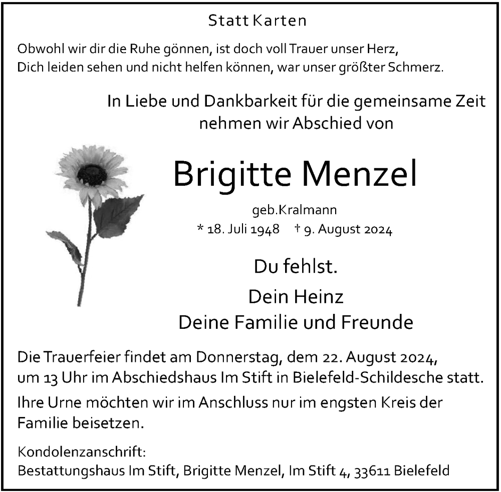 Hier finden Sie alle Traueranzeigen aus der Zeitung, die bisher für Brigitte Menzel erschienen sind. Weitere Traueranzeigen, die in der Zeitung erscheinen, werden hier ebenfalls aufgelistet