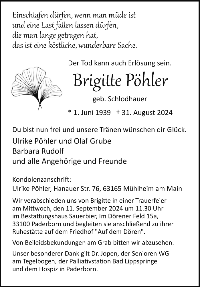 Hier finden Sie alle Traueranzeigen aus der Zeitung, die bisher für Brigitte Pöhler erschienen sind. Weitere Traueranzeigen, die in der Zeitung erscheinen, werden hier ebenfalls aufgelistet