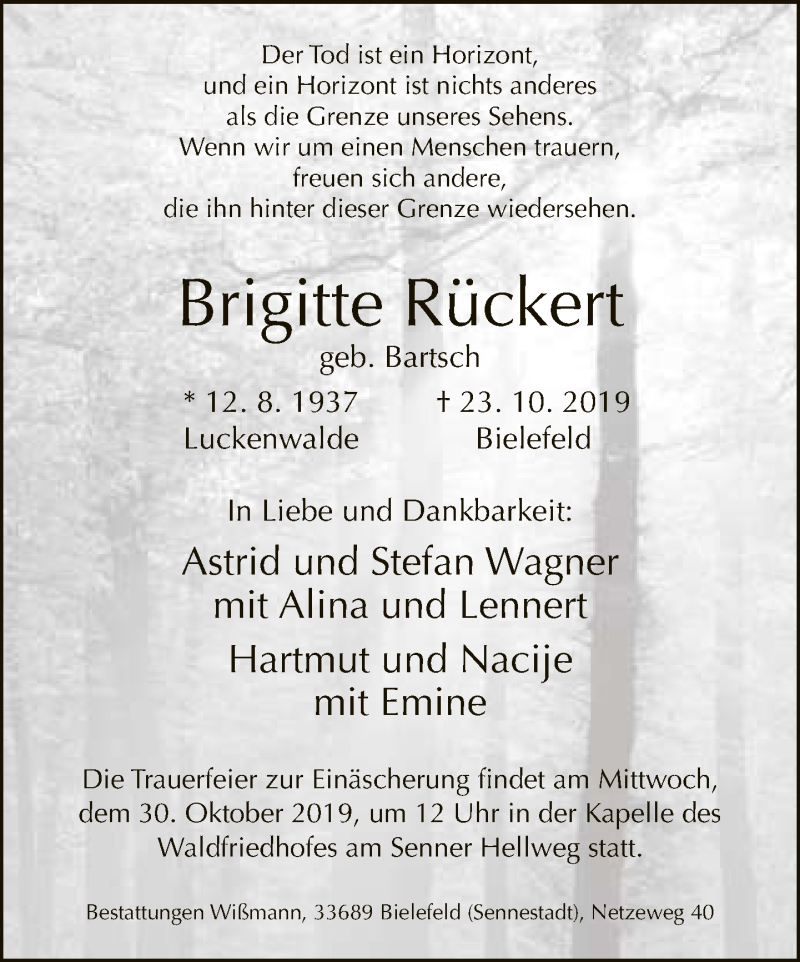 Hier finden Sie alle Traueranzeigen aus der Zeitung, die bisher für Brigitte Rückert erschienen sind. Weitere Traueranzeigen, die in der Zeitung erscheinen, werden hier ebenfalls aufgelistet
