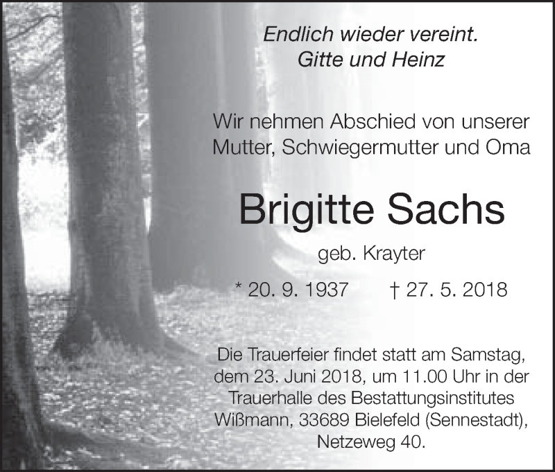 Hier finden Sie alle Traueranzeigen aus der Zeitung, die bisher für Brigitte Sachs erschienen sind. Weitere Traueranzeigen, die in der Zeitung erscheinen, werden hier ebenfalls aufgelistet