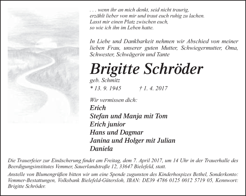 Hier finden Sie alle Traueranzeigen aus der Zeitung, die bisher für Brigitte Schröder erschienen sind. Weitere Traueranzeigen, die in der Zeitung erscheinen, werden hier ebenfalls aufgelistet