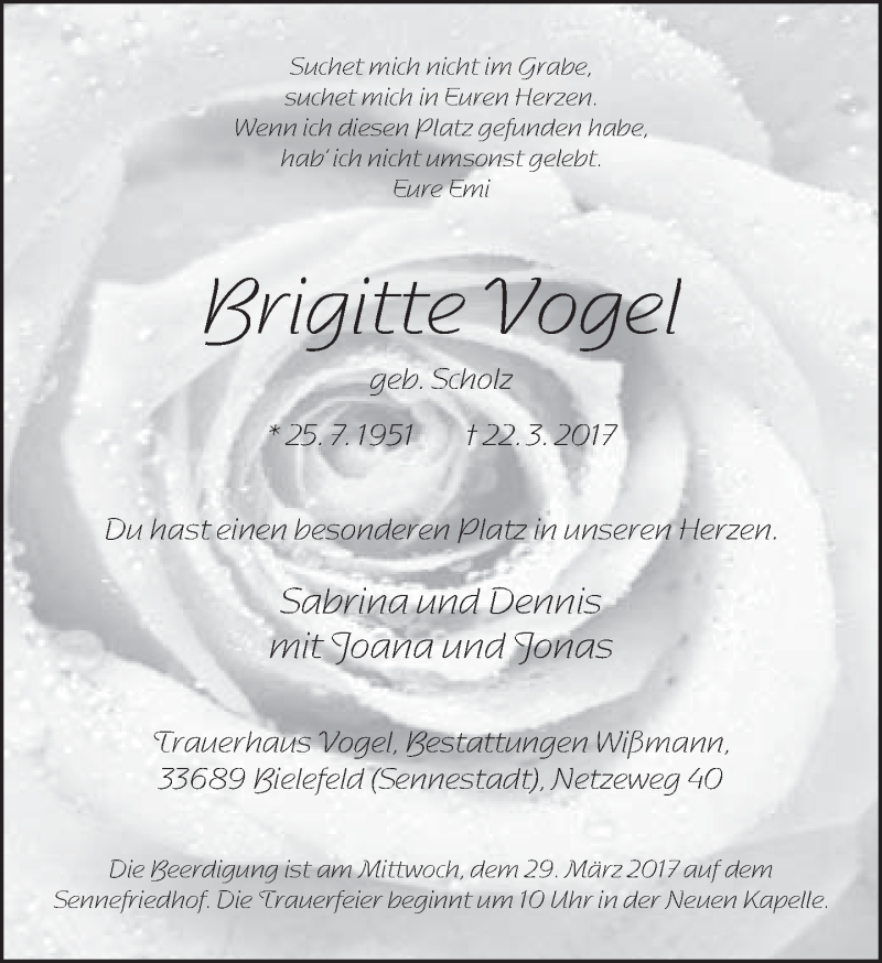 Hier finden Sie alle Traueranzeigen aus der Zeitung, die bisher für Brigitte Vogel erschienen sind. Weitere Traueranzeigen, die in der Zeitung erscheinen, werden hier ebenfalls aufgelistet