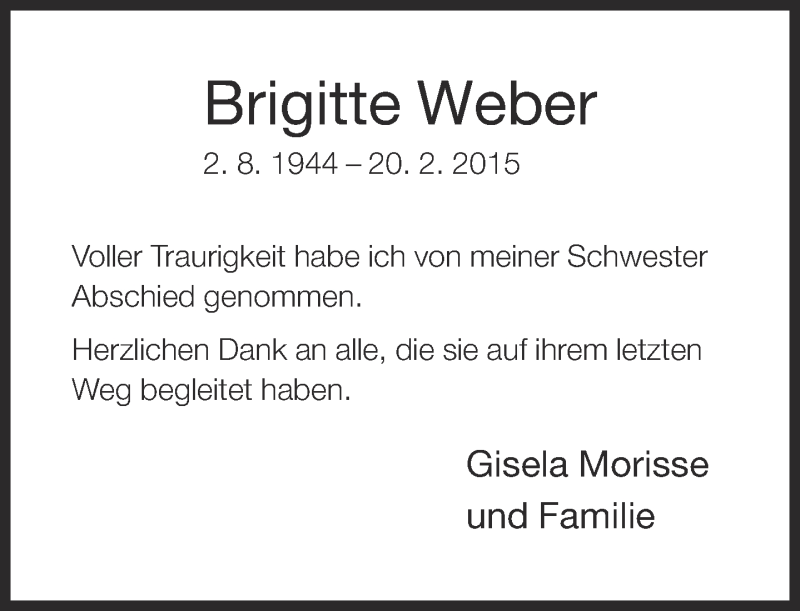 Hier finden Sie alle Traueranzeigen aus der Zeitung, die bisher für Brigitte Weber erschienen sind. Weitere Traueranzeigen, die in der Zeitung erscheinen, werden hier ebenfalls aufgelistet