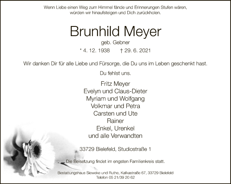 Hier finden Sie alle Traueranzeigen aus der Zeitung, die bisher für Brunhild Meyer erschienen sind. Weitere Traueranzeigen, die in der Zeitung erscheinen, werden hier ebenfalls aufgelistet