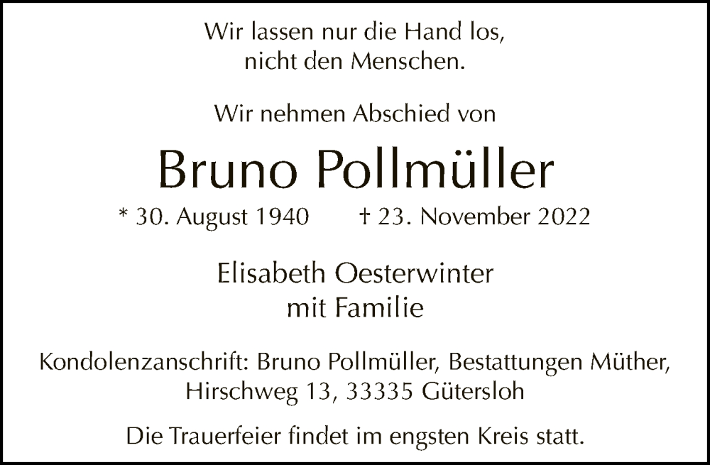 Hier finden Sie alle Traueranzeigen aus der Zeitung, die bisher für Bruno Pollmüller erschienen sind. Weitere Traueranzeigen, die in der Zeitung erscheinen, werden hier ebenfalls aufgelistet