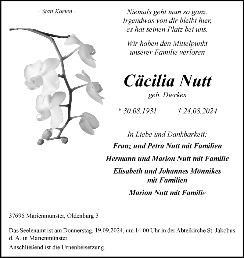 Hier finden Sie alle Traueranzeigen aus der Zeitung, die bisher für Cäcilia Nutt erschienen sind. Weitere Traueranzeigen, die in der Zeitung erscheinen, werden hier ebenfalls aufgelistet
