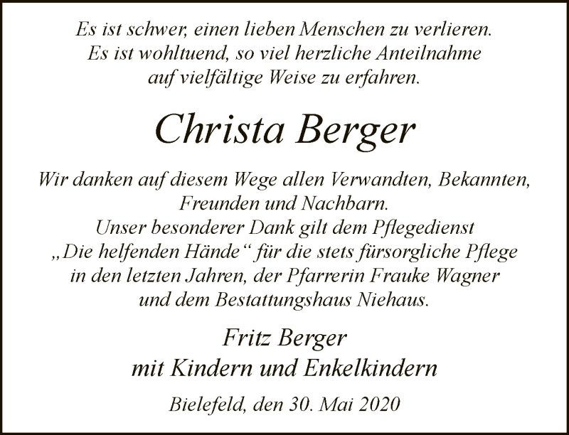 Hier finden Sie alle Traueranzeigen aus der Zeitung, die bisher für Christa Berger erschienen sind. Weitere Traueranzeigen, die in der Zeitung erscheinen, werden hier ebenfalls aufgelistet