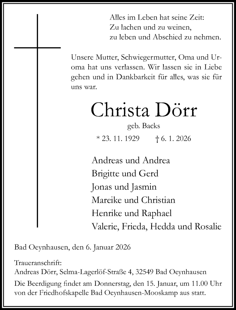 Hier finden Sie alle Traueranzeigen aus der Zeitung, die bisher für Christa Dörr erschienen sind. Weitere Traueranzeigen, die in der Zeitung erscheinen, werden hier ebenfalls aufgelistet