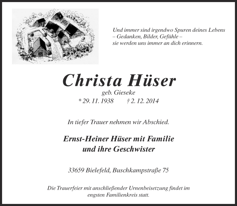 Hier finden Sie alle Traueranzeigen aus der Zeitung, die bisher für Christa Hüser erschienen sind. Weitere Traueranzeigen, die in der Zeitung erscheinen, werden hier ebenfalls aufgelistet