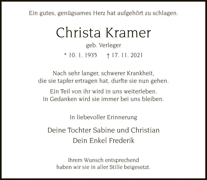 Hier finden Sie alle Traueranzeigen aus der Zeitung, die bisher für Christa Kramer erschienen sind. Weitere Traueranzeigen, die in der Zeitung erscheinen, werden hier ebenfalls aufgelistet