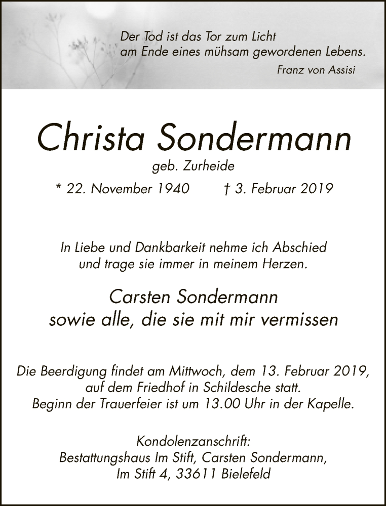 Hier finden Sie alle Traueranzeigen aus der Zeitung, die bisher für Christa Sondermann erschienen sind. Weitere Traueranzeigen, die in der Zeitung erscheinen, werden hier ebenfalls aufgelistet
