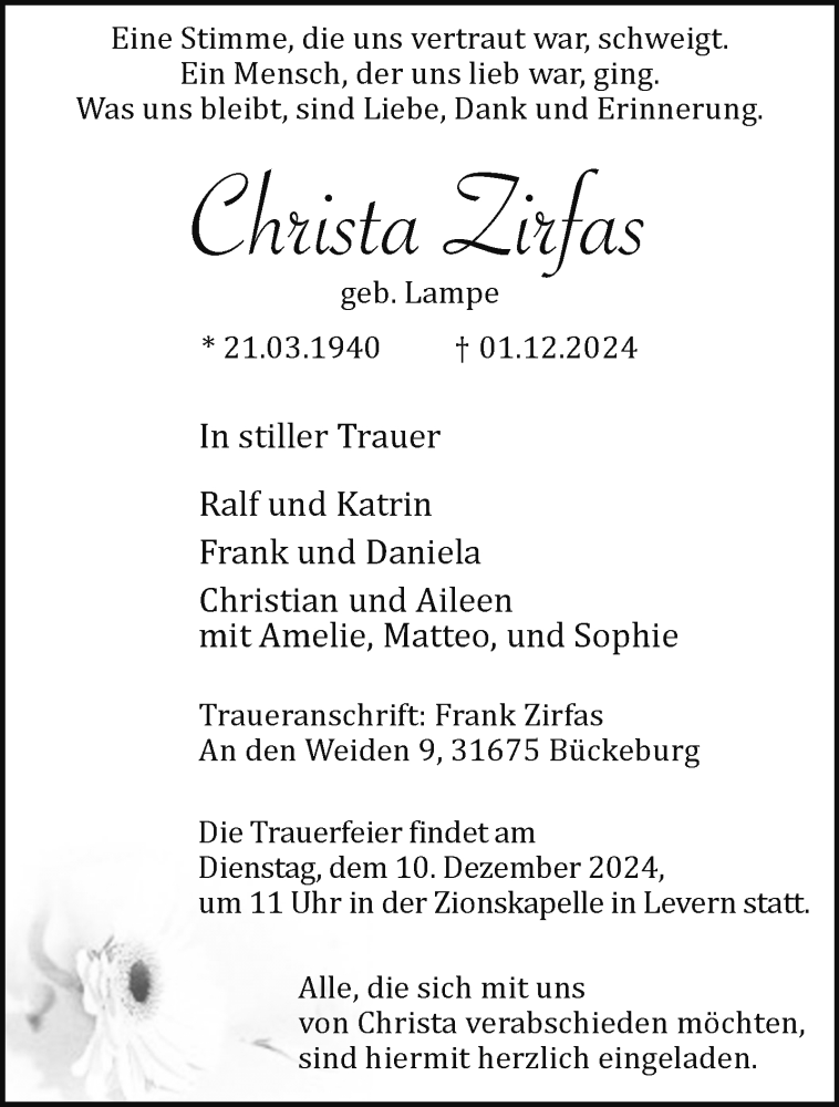 Hier finden Sie alle Traueranzeigen aus der Zeitung, die bisher für Christa Zirfas erschienen sind. Weitere Traueranzeigen, die in der Zeitung erscheinen, werden hier ebenfalls aufgelistet