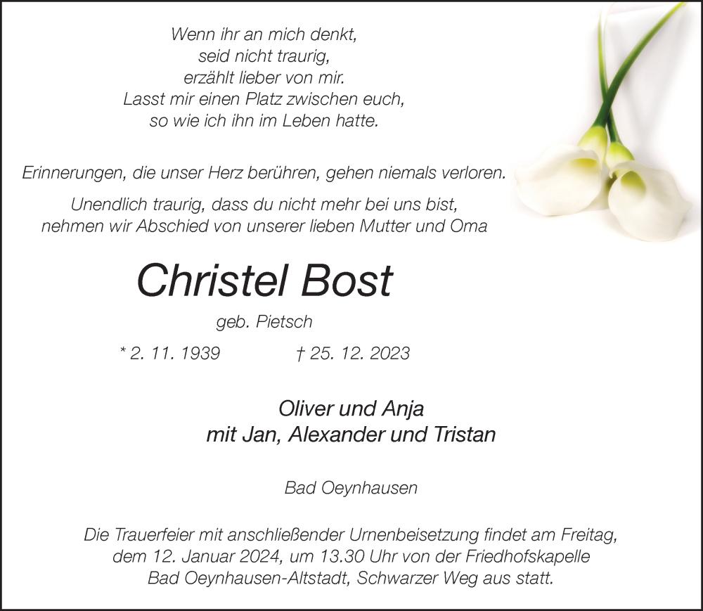 Hier finden Sie alle Traueranzeigen aus der Zeitung, die bisher für Christel Bost erschienen sind. Weitere Traueranzeigen, die in der Zeitung erscheinen, werden hier ebenfalls aufgelistet
