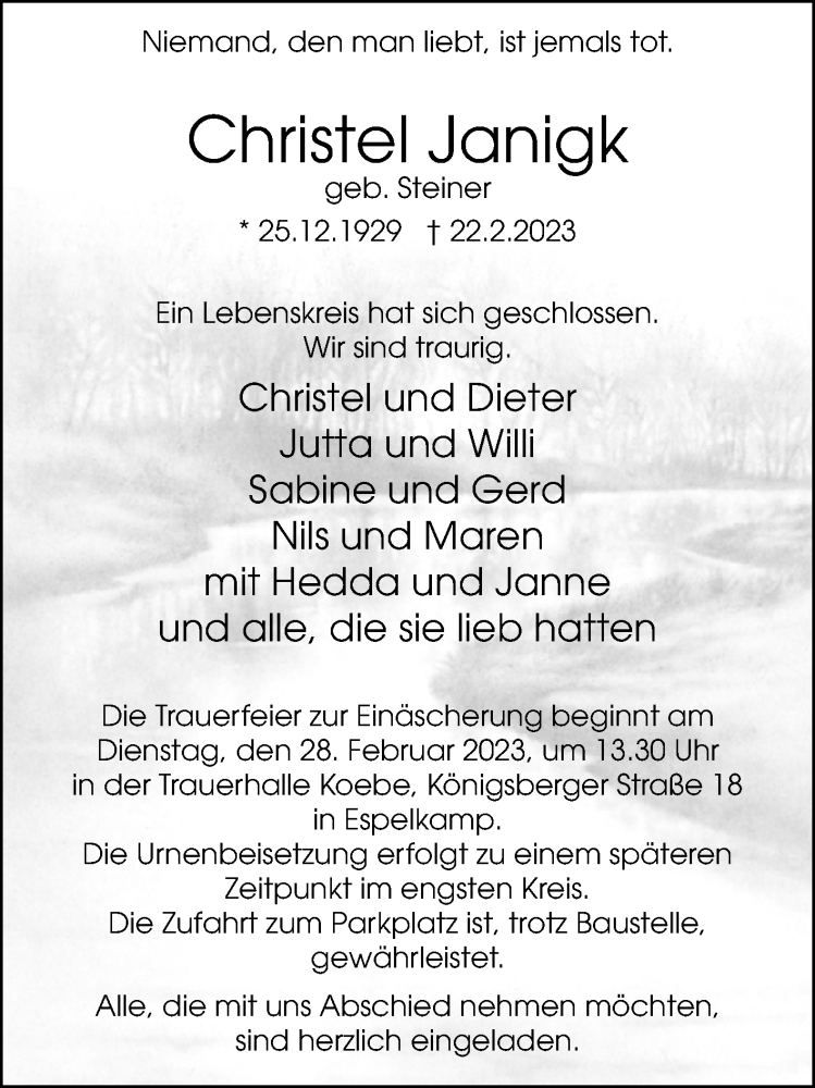 Hier finden Sie alle Traueranzeigen aus der Zeitung, die bisher für Christel Janigk erschienen sind. Weitere Traueranzeigen, die in der Zeitung erscheinen, werden hier ebenfalls aufgelistet