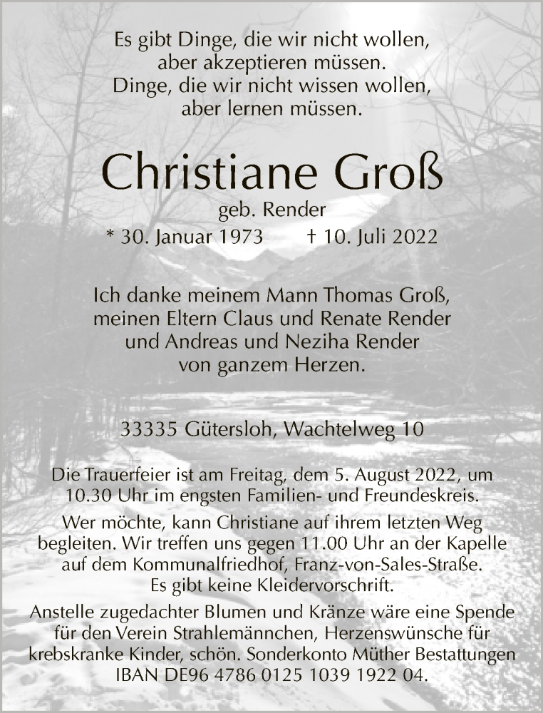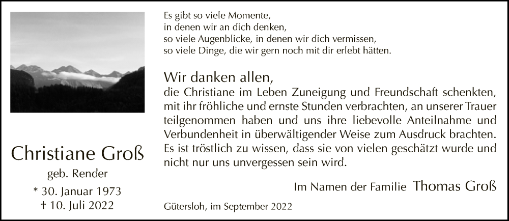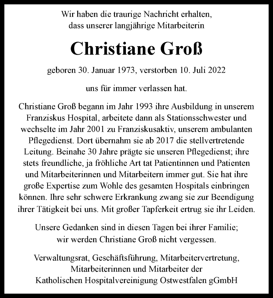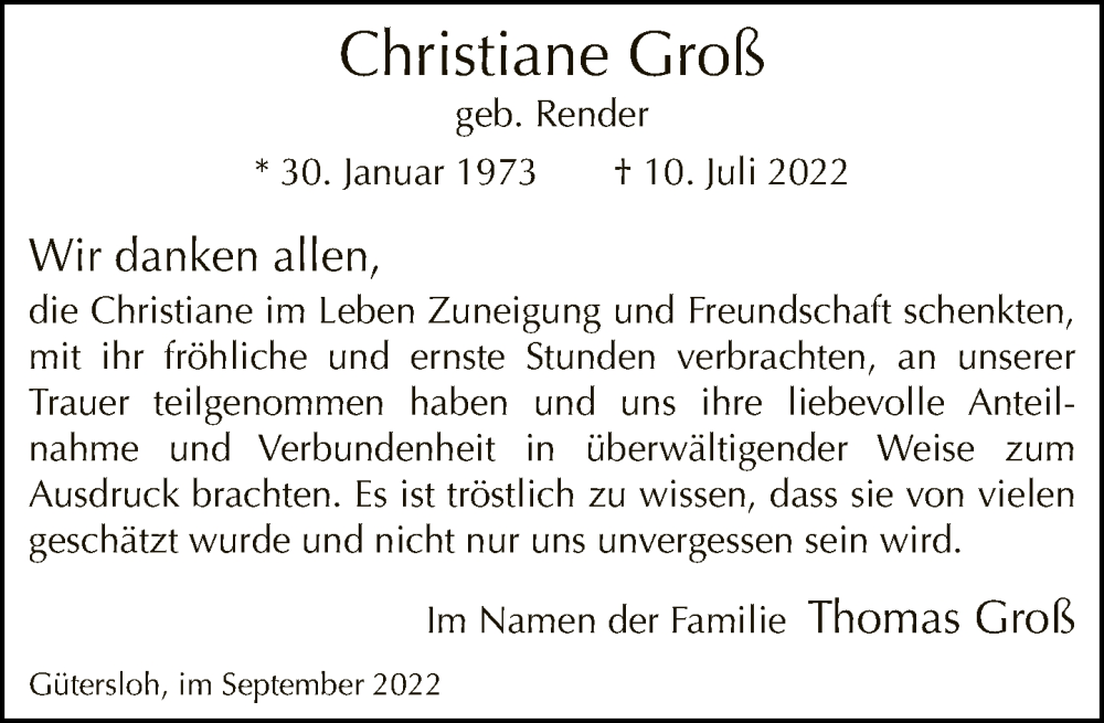 Hier finden Sie alle Traueranzeigen aus der Zeitung, die bisher für Christiane Groß erschienen sind. Weitere Traueranzeigen, die in der Zeitung erscheinen, werden hier ebenfalls aufgelistet