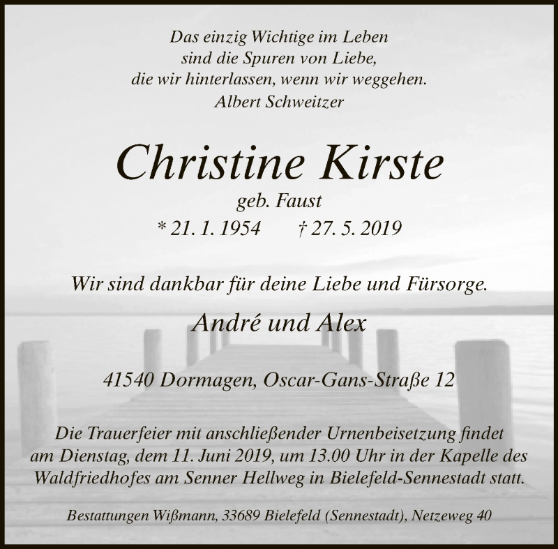 Hier finden Sie alle Traueranzeigen aus der Zeitung, die bisher für Christine Kirste erschienen sind. Weitere Traueranzeigen, die in der Zeitung erscheinen, werden hier ebenfalls aufgelistet