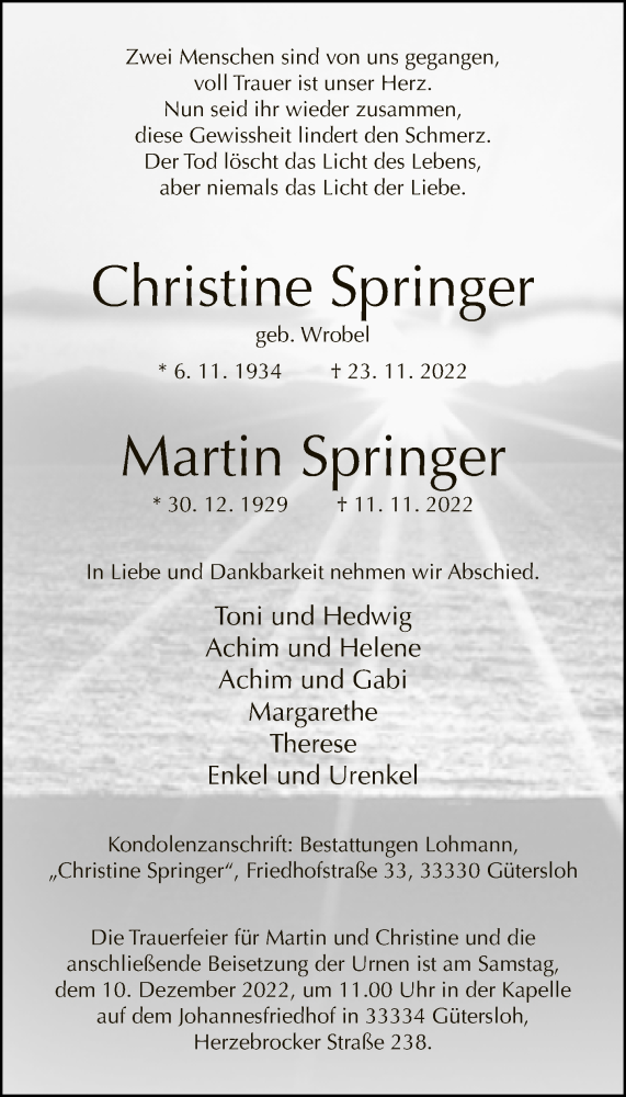 Hier finden Sie alle Traueranzeigen aus der Zeitung, die bisher für Christine und Martin Springer erschienen sind. Weitere Traueranzeigen, die in der Zeitung erscheinen, werden hier ebenfalls aufgelistet