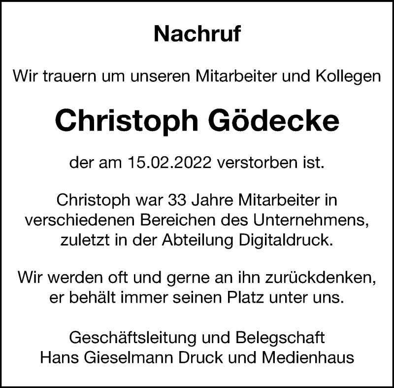 Hier finden Sie alle Traueranzeigen aus der Zeitung, die bisher für Christoph Gödecke erschienen sind. Weitere Traueranzeigen, die in der Zeitung erscheinen, werden hier ebenfalls aufgelistet