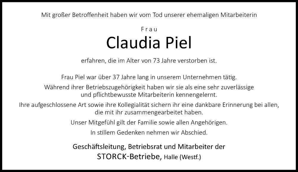 Hier finden Sie alle Traueranzeigen aus der Zeitung, die bisher für Claudia Piel erschienen sind. Weitere Traueranzeigen, die in der Zeitung erscheinen, werden hier ebenfalls aufgelistet
