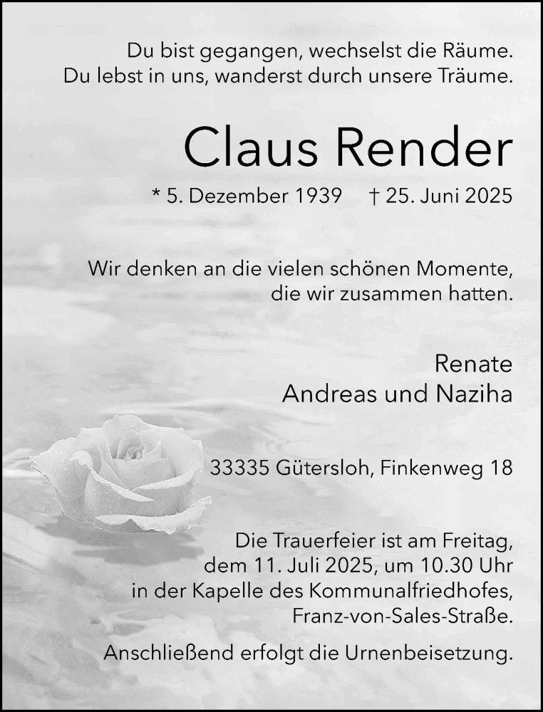 Hier finden Sie alle Traueranzeigen aus der Zeitung, die bisher für Claus Render erschienen sind. Weitere Traueranzeigen, die in der Zeitung erscheinen, werden hier ebenfalls aufgelistet