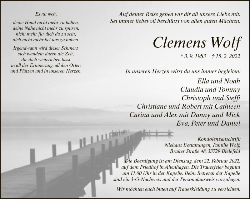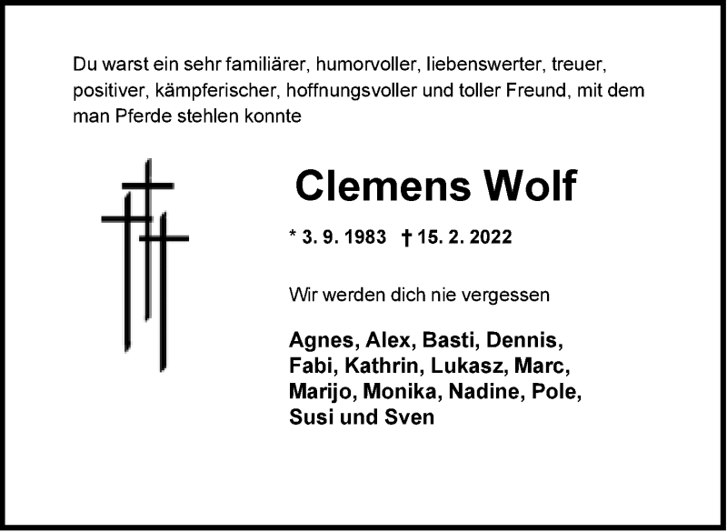 Hier finden Sie alle Traueranzeigen aus der Zeitung, die bisher für Clemens Wolf erschienen sind. Weitere Traueranzeigen, die in der Zeitung erscheinen, werden hier ebenfalls aufgelistet