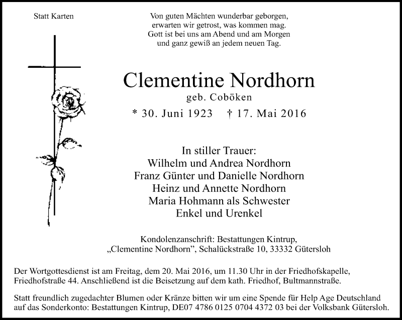 Hier finden Sie alle Traueranzeigen aus der Zeitung, die bisher für Clementine Nordhorn erschienen sind. Weitere Traueranzeigen, die in der Zeitung erscheinen, werden hier ebenfalls aufgelistet