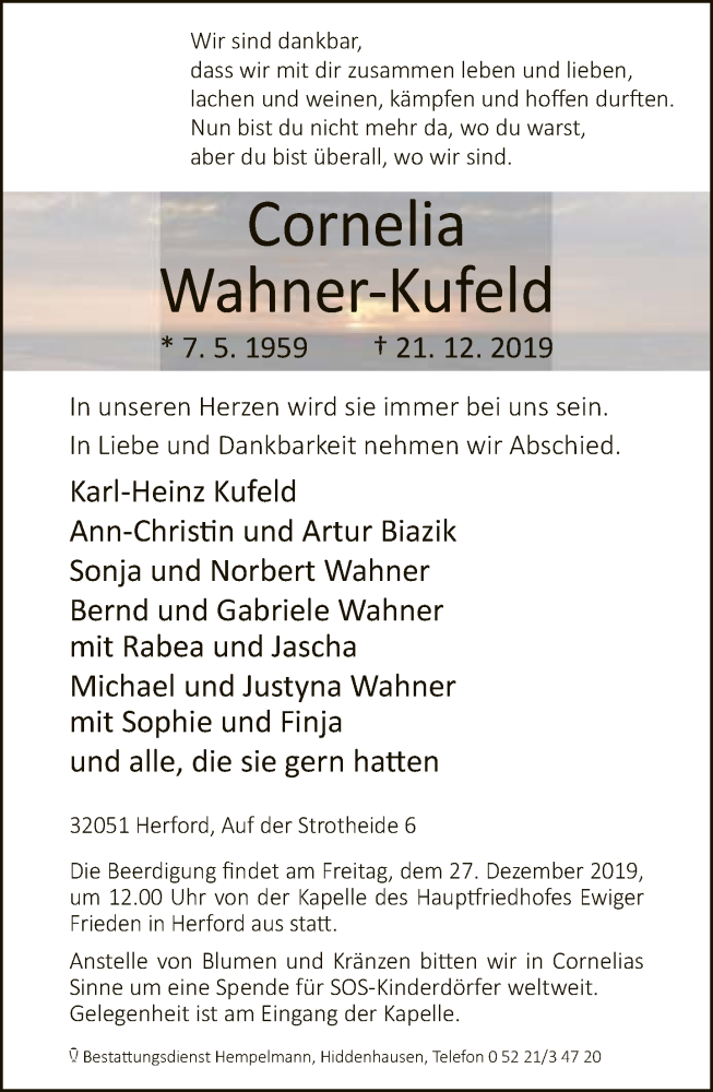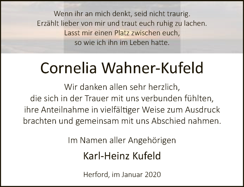 Hier finden Sie alle Traueranzeigen aus der Zeitung, die bisher für Cornelia Wahner-Kufeld erschienen sind. Weitere Traueranzeigen, die in der Zeitung erscheinen, werden hier ebenfalls aufgelistet