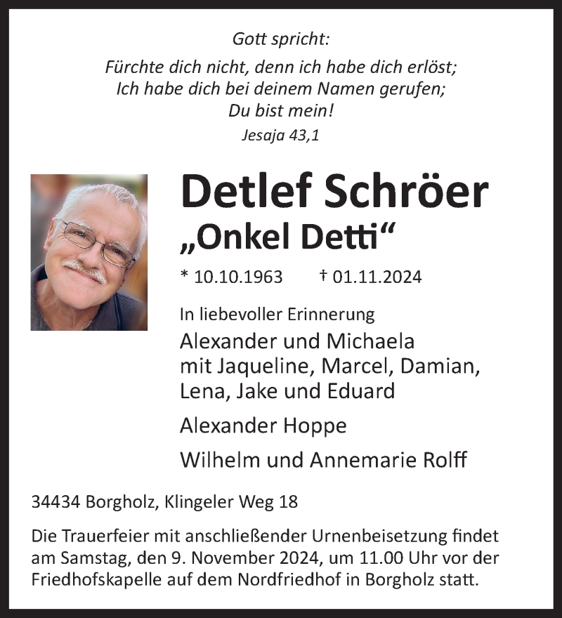 Hier finden Sie alle Traueranzeigen aus der Zeitung, die bisher für Detlef Schröer erschienen sind. Weitere Traueranzeigen, die in der Zeitung erscheinen, werden hier ebenfalls aufgelistet