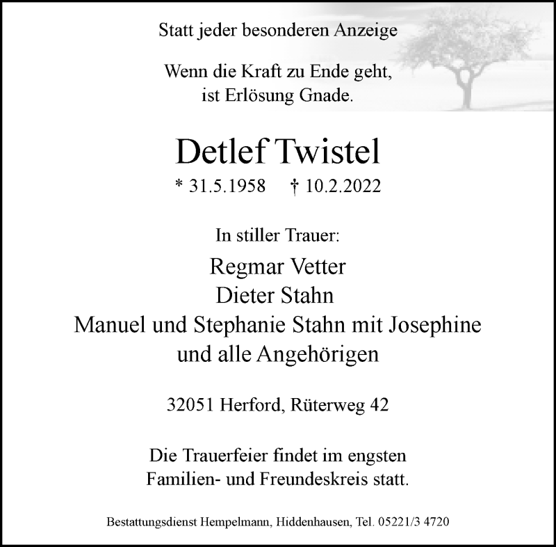 Hier finden Sie alle Traueranzeigen aus der Zeitung, die bisher für Detlef Twistel erschienen sind. Weitere Traueranzeigen, die in der Zeitung erscheinen, werden hier ebenfalls aufgelistet