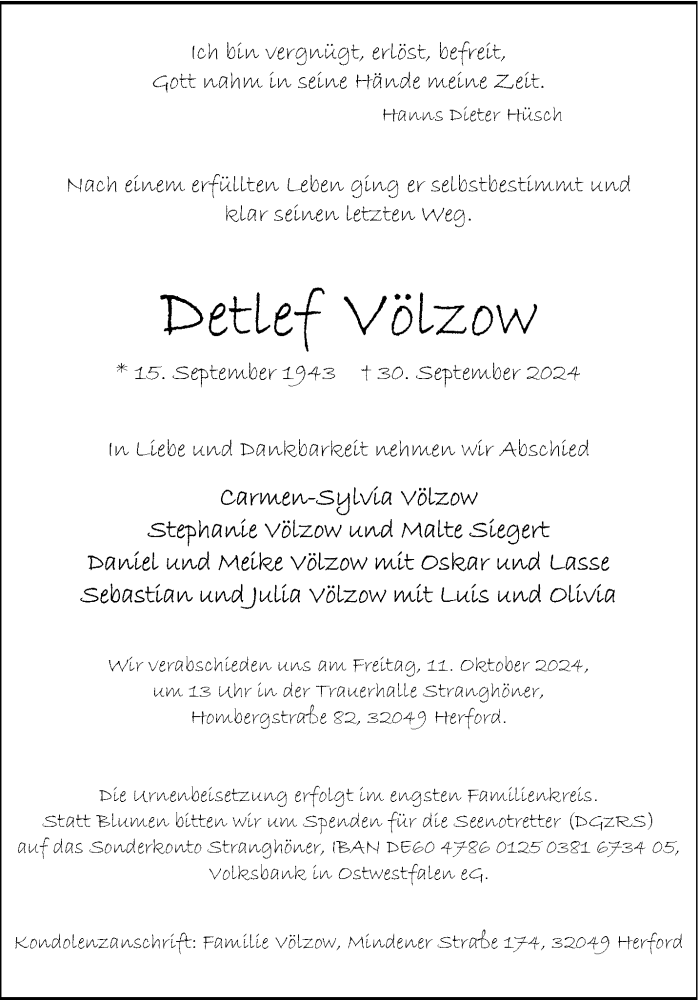 Hier finden Sie alle Traueranzeigen aus der Zeitung, die bisher für Detlef Völzow erschienen sind. Weitere Traueranzeigen, die in der Zeitung erscheinen, werden hier ebenfalls aufgelistet