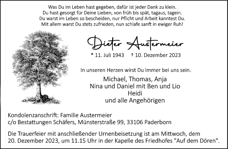 Hier finden Sie alle Traueranzeigen aus der Zeitung, die bisher für Dieter Austermeier erschienen sind. Weitere Traueranzeigen, die in der Zeitung erscheinen, werden hier ebenfalls aufgelistet