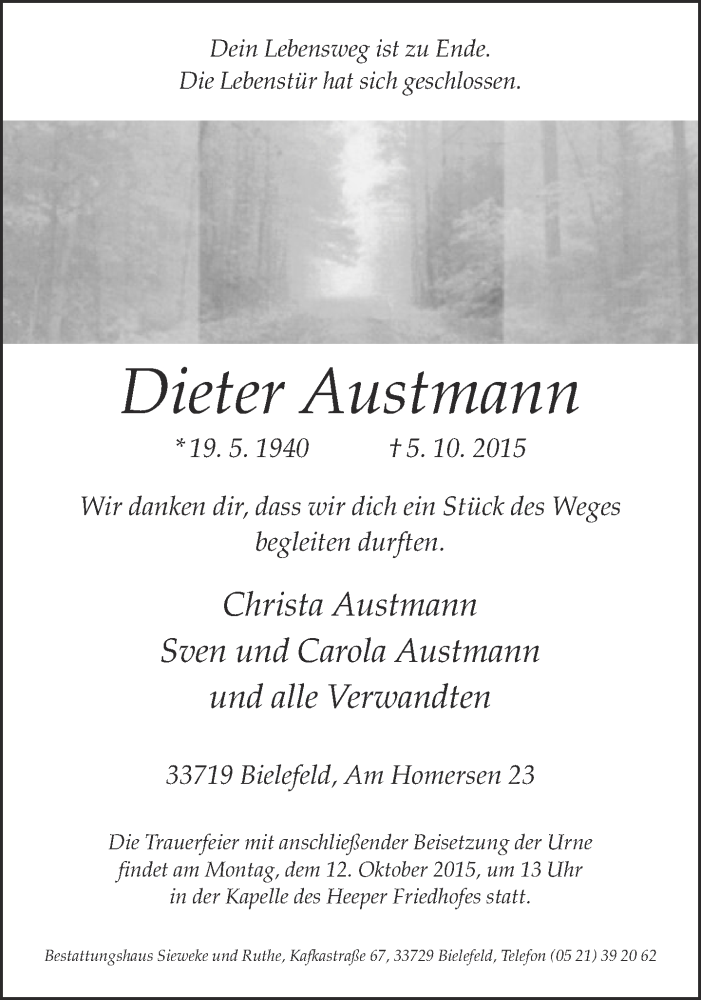 Hier finden Sie alle Traueranzeigen aus der Zeitung, die bisher für Dieter Austmann erschienen sind. Weitere Traueranzeigen, die in der Zeitung erscheinen, werden hier ebenfalls aufgelistet