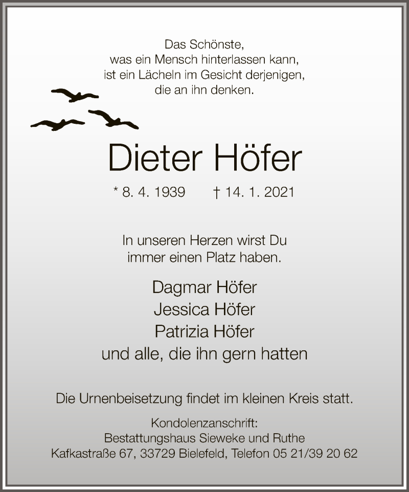 Hier finden Sie alle Traueranzeigen aus der Zeitung, die bisher für Dieter Höfer erschienen sind. Weitere Traueranzeigen, die in der Zeitung erscheinen, werden hier ebenfalls aufgelistet