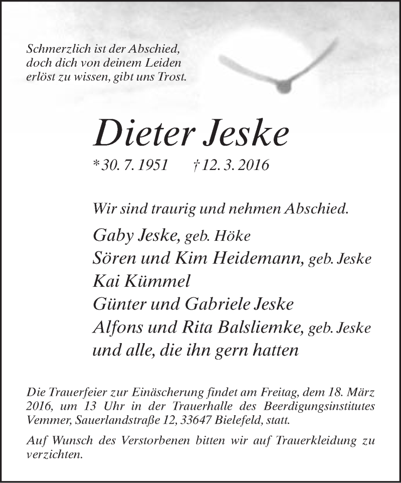 Hier finden Sie alle Traueranzeigen aus der Zeitung, die bisher für Dieter Jeske erschienen sind. Weitere Traueranzeigen, die in der Zeitung erscheinen, werden hier ebenfalls aufgelistet